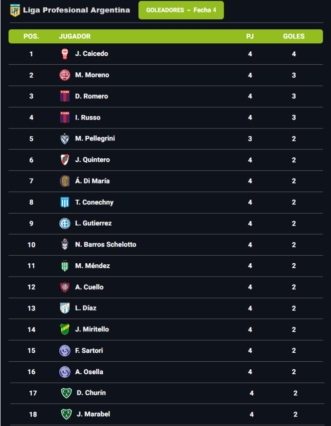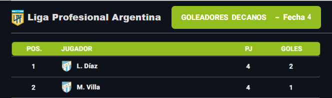 GOLEADORES DEL TORNEO DE LA LIGA PROFESIONAL DE FUTBOL - Fecha 4